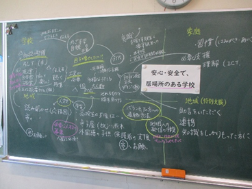5時間目の授業参観後、「安心・安全 誰もが居場所のある学校」をテーマに話し合いを行いました。前期学校評価の結果・ご意見等も踏まえながら、保護者、地域、学校等それぞれの立場から今後のよりよい学校創りに向けて、前向きで建設的な話し合いを行いました。